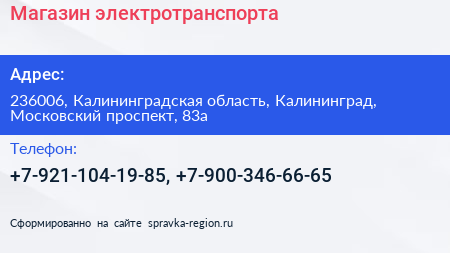 Магазин электротранспорта по адресу 236006, Калининградская область, Калининград, Московский проспект, 83а в дальнейшем Организация, размещена в следующих категориях: