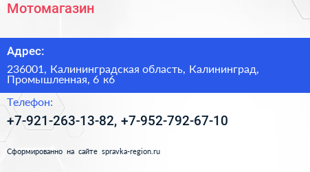 Мотомагазин по адресу 236001, Калининградская область, Калининград, Промышленная, 6 к6 в дальнейшем Организация, размещена в следующих категориях: