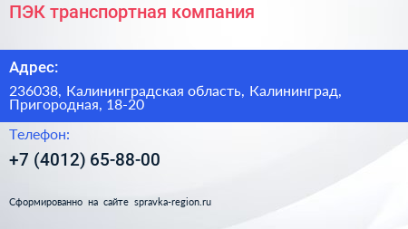 ПЭК, транспортная компания по адресу 236038, Калининградская область, Калининград, Пригородная, 18-20 в дальнейшем Организация, размещена в следующих категориях: