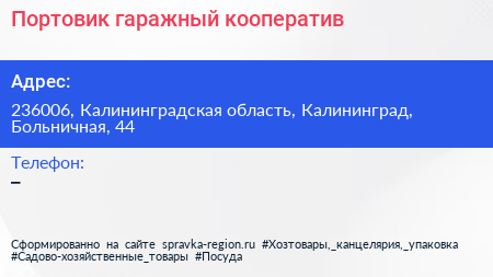 Портовик, гаражный кооператив по адресу 236006, Калининградская область, Калининград, Больничная, 44 в дальнейшем Организация, размещена в следующих категориях: