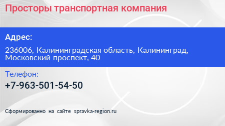 Просторы, транспортная компания по адресу 236006, Калининградская область, Калининград, Московский проспект, 40 в дальнейшем Организация, размещена в следующих категориях: