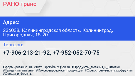 РАНО-транс по адресу 236038, Калининградская область, Калининград, Пригородная, 18-20 в дальнейшем Организация, размещена в следующих категориях: