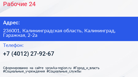 Рабочие 24 по адресу 236001, Калининградская область, Калининград, Гаражная, 2-2а в дальнейшем Организация, размещена в следующих категориях: