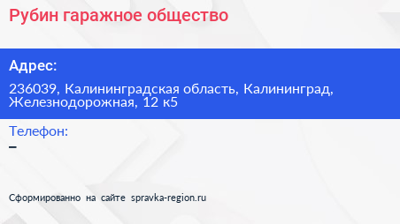 Рубин, гаражное общество по адресу 236039, Калининградская область, Калининград, Железнодорожная, 12 к5 в дальнейшем Организация, размещена в следующих категориях: