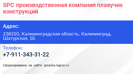 SPC, производственная компания плавучих конструкций по адресу 238310, Калининградская область, Калининград, Шатурская, 1Б в дальнейшем Организация, размещена в следующих категориях: