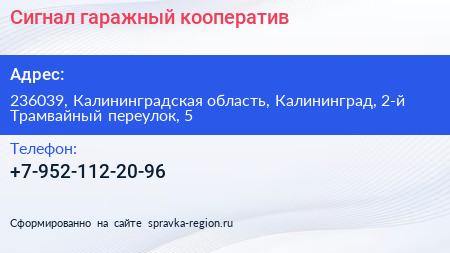 Сигнал, гаражный кооператив по адресу 236039, Калининградская область, Калининград, 2-й Трамвайный переулок, 5 в дальнейшем Организация, размещена в следующих категориях: