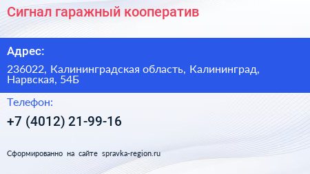 Сигнал, гаражный кооператив по адресу 236022, Калининградская область, Калининград, Нарвская, 54Б в дальнейшем Организация, размещена в следующих категориях: