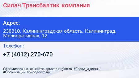 Силач-Трансбалтик, компания по адресу 238310, Калининградская область, Калининград, Мелиоративная, 12 в дальнейшем Организация, размещена в следующих категориях: