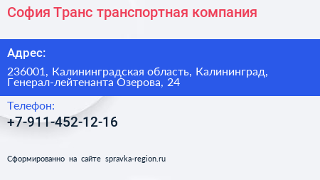 София-Транс, транспортная компания по адресу 236001, Калининградская область, Калининград, Генерал-лейтенанта Озерова, 24 в дальнейшем Организация, размещена в следующих категориях: