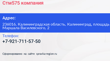 Стм575, компания по адресу 236016, Калининградская область, Калининград, площадь Маршала Василевского, 2 в дальнейшем Организация, размещена в следующих категориях: