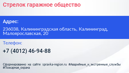 Стрелок, гаражное общество по адресу 236038, Калининградская область, Калининград, Малоярославская, 20 в дальнейшем Организация, размещена в следующих категориях: