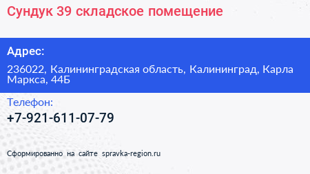 Сундук 39, складское помещение по адресу 236022, Калининградская область, Калининград, Карла Маркса, 44Б в дальнейшем Организация, размещена в следующих категориях: