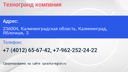 Техногранд, компания по адресу 236004, Калининградская область, Калининград, Яблочная, 3 в дальнейшем Организация, размещена в следующих категориях: