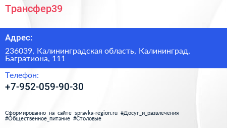 Трансфер39 по адресу 236039, Калининградская область, Калининград, Багратиона, 111 в дальнейшем Организация, размещена в следующих категориях: