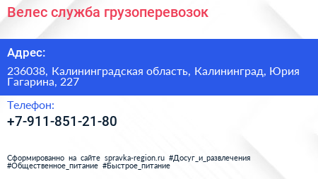 Велес, служба грузоперевозок по адресу 236038, Калининградская область, Калининград, Юрия Гагарина, 227 в дальнейшем Организация, размещена в следующих категориях: