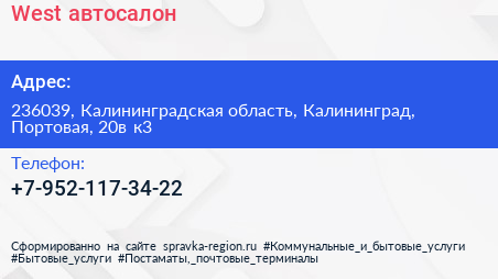 West, автосалон по адресу 236039, Калининградская область, Калининград, Портовая, 20в к3 в дальнейшем Организация, размещена в следующих категориях: