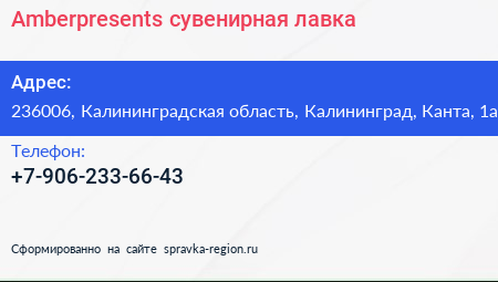 Amberpresents, сувенирная лавка по адресу 236006, Калининградская область, Калининград, Канта, 1а в дальнейшем Организация, размещена в следующих категориях: