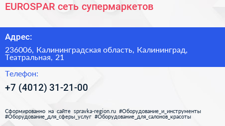 EUROSPAR, сеть супермаркетов по адресу 236006, Калининградская область, Калининград, Театральная, 21 в дальнейшем Организация, размещена в следующих категориях: