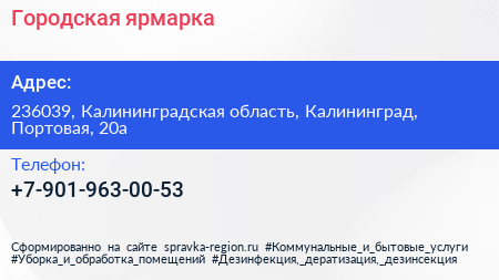 Городская ярмарка по адресу 236039, Калининградская область, Калининград, Портовая, 20а в дальнейшем Организация, размещена в следующих категориях: