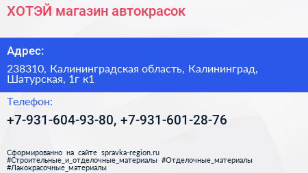 ХОТЭЙ, магазин автокрасок по адресу 238310, Калининградская область, Калининград, Шатурская, 1г к1 в дальнейшем Организация, размещена в следующих категориях: