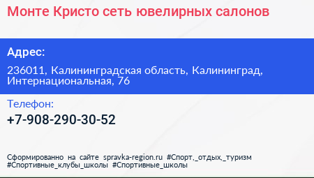 Монте Кристо, сеть ювелирных салонов по адресу 236011, Калининградская область, Калининград, Интернациональная, 76 в дальнейшем Организация, размещена в следующих категориях: