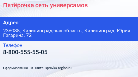 Пятёрочка, сеть универсамов по адресу 236038, Калининградская область, Калининград, Юрия Гагарина, 72 в дальнейшем Организация, размещена в следующих категориях: