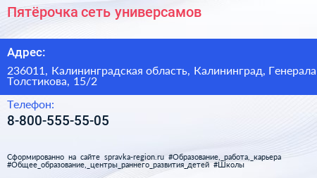 Пятёрочка, сеть универсамов по адресу 236011, Калининградская область, Калининград, Генерала Толстикова, 15/2 в дальнейшем Организация, размещена в следующих категориях: