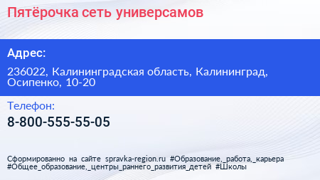 Пятёрочка, сеть универсамов по адресу 236022, Калининградская область, Калининград, Осипенко, 10-20 в дальнейшем Организация, размещена в следующих категориях: