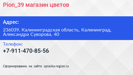 Pion_39, магазин цветов по адресу 236039, Калининградская область, Калининград, Александра Суворова, 40 в дальнейшем Организация, размещена в следующих категориях: