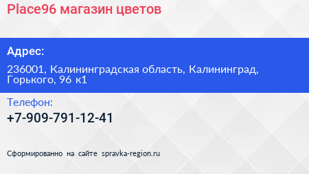 Place96, магазин цветов по адресу 236001, Калининградская область, Калининград, Горького, 96 к1 в дальнейшем Организация, размещена в следующих категориях:
