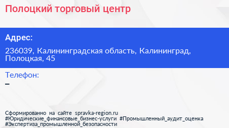 Полоцкий, торговый центр по адресу 236039, Калининградская область, Калининград, Полоцкая, 45 в дальнейшем Организация, размещена в следующих категориях: