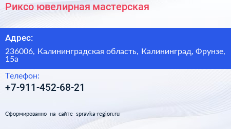 Риксо, ювелирная мастерская по адресу 236006, Калининградская область, Калининград, Фрунзе, 15а в дальнейшем Организация, размещена в следующих категориях: