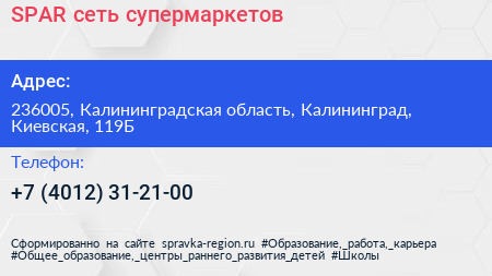 SPAR, сеть супермаркетов по адресу 236005, Калининградская область, Калининград, Киевская, 119Б в дальнейшем Организация, размещена в следующих категориях: