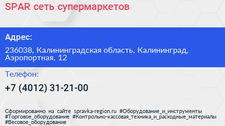 SPAR, сеть супермаркетов по адресу 236038, Калининградская область, Калининград, Аэропортная, 12 в дальнейшем Организация, размещена в следующих категориях: