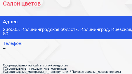 Салон цветов по адресу 236005, Калининградская область, Калининград, Киевская, 80 в дальнейшем Организация, размещена в следующих категориях: