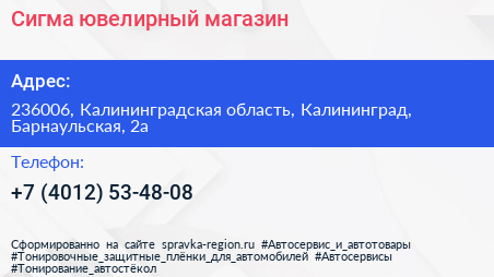 Сигма, ювелирный магазин по адресу 236006, Калининградская область, Калининград, Барнаульская, 2а в дальнейшем Организация, размещена в следующих категориях:
