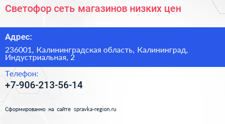 Светофор, сеть магазинов низких цен по адресу 236001, Калининградская область, Калининград, Индустриальная, 2 в дальнейшем Организация, размещена в следующих категориях: