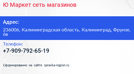 Ю Маркет, сеть магазинов по адресу 236006, Калининградская область, Калининград, Фрунзе, 6в в дальнейшем Организация, размещена в следующих категориях: