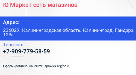 Ю Маркет, сеть магазинов по адресу 236029, Калининградская область, Калининград, Гайдара, 129а в дальнейшем Организация, размещена в следующих категориях: