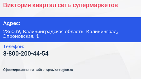 Виктория квартал, сеть супермаркетов по адресу 236039, Калининградская область, Калининград, Эпроновская, 1 в дальнейшем Организация, размещена в следующих категориях: