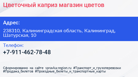 Цветочный каприз, магазин цветов по адресу 238310, Калининградская область, Калининград, Шатурская, 10 в дальнейшем Организация, размещена в следующих категориях: