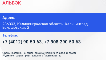 АЛЬВЭК по адресу 236003, Калининградская область, Калининград, Балашовская, 2 в дальнейшем Организация, размещена в следующих категориях: