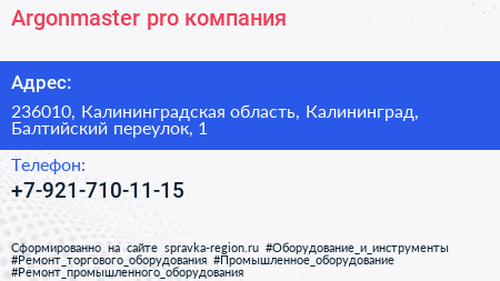 Argonmaster.pro, компания по адресу 236010, Калининградская область, Калининград, Балтийский переулок, 1 в дальнейшем Организация, размещена в следующих категориях: