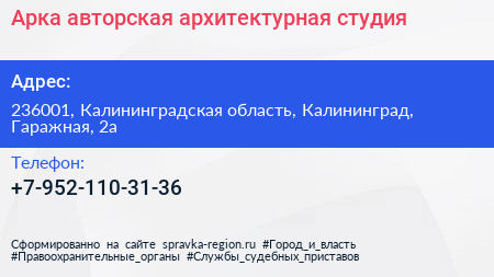 Арка, авторская архитектурная студия по адресу 236001, Калининградская область, Калининград, Гаражная, 2а в дальнейшем Организация, размещена в следующих категориях: