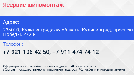 Ясервис, шиномонтаж по адресу 236010, Калининградская область, Калининград, проспект Победы, 279 к1 в дальнейшем Организация, размещена в следующих категориях: