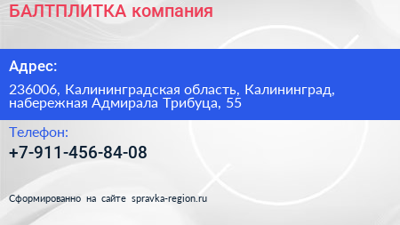 БАЛТПЛИТКА, компания по адресу 236006, Калининградская область, Калининград, набережная Адмирала Трибуца, 55 в дальнейшем Организация, размещена в следующих категориях: