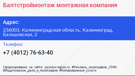 Балтстроймонтаж, монтажная компания по адресу 236003, Калининградская область, Калининград, Балашовская, 2 в дальнейшем Организация, размещена в следующих категориях:
