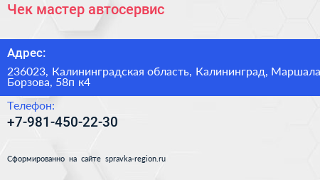 Чек-мастер, автосервис по адресу 236023, Калининградская область, Калининград, Маршала Борзова, 58п к4 в дальнейшем Организация, размещена в следующих категориях: