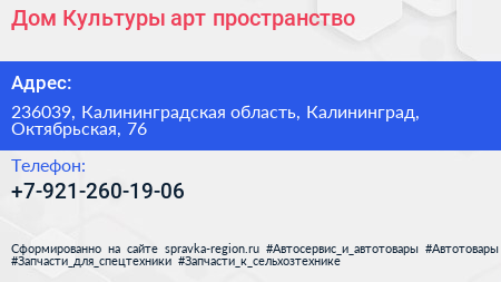Дом Культуры, арт-пространство по адресу 236039, Калининградская область, Калининград, Октябрьская, 76 в дальнейшем Организация, размещена в следующих категориях: