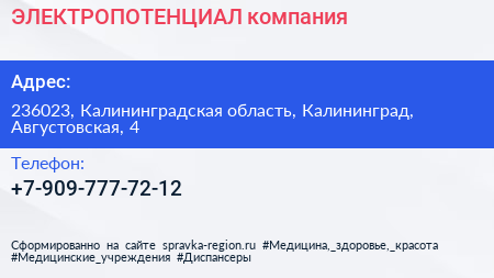 ЭЛЕКТРОПОТЕНЦИАЛ, компания по адресу 236023, Калининградская область, Калининград, Августовская, 4 в дальнейшем Организация, размещена в следующих категориях: